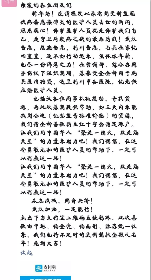 倡议发出不久,大家积极响应。截止28日收到员工爱心捐款23420元,31日收到爱心捐款4200元整。专项用于利川市新型冠状病毒感染的肺炎疫情防控专项资金捐助以及救治急需物资的采购。收到党员干部职工爱心捐款共计27620元整分别于1月28日,2月1日将员工捐赠专项款汇入利川市红十字会工行账户。力量虽小,但我们"同舟共济"战胜疫情。