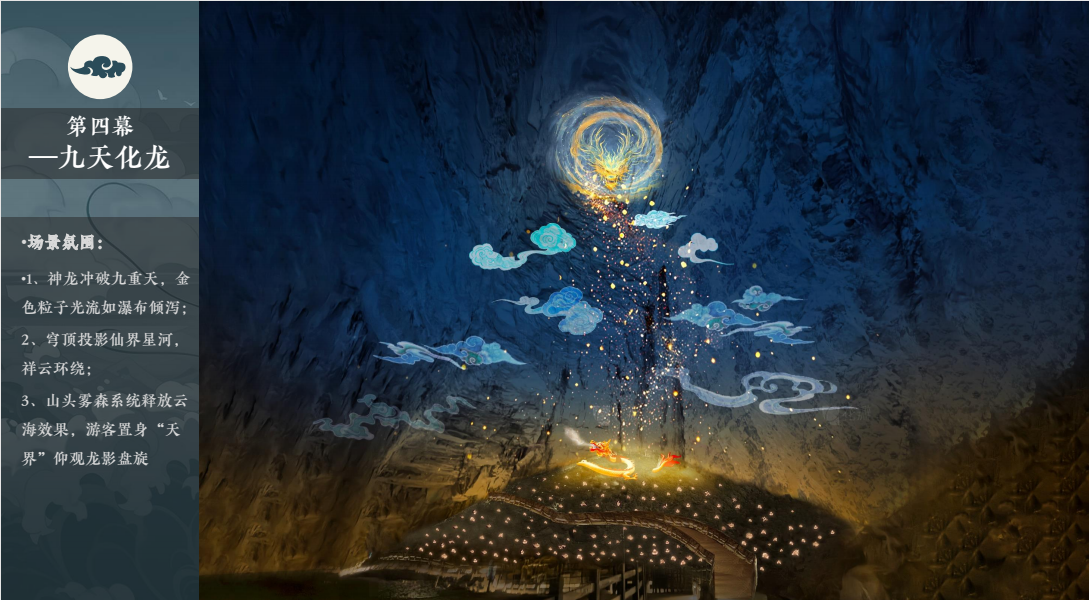 04 总体规划:七大幕剧重塑游览体验 最具创新性的是,团队提出了“一廊、二秀、七幕、十八点”的总体规划框架,以“神龙苏醒到归墟”为核心叙事主线,打造七幕“可探索、可互动、可传播”的洞穴光影剧场。 七幕剧情围绕“神龙降世-龙族试炼-人龙共生-九龙归墟”神话展开,串联地质奇观与土家传说,让游客成为神话的参与者而非旁观者。 龙鳞山区域将以“神龙渡劫·穹顶飞升”为主题,通过光影、声效、互动装置与自然地貌的融合,构建虚实结合的玄幻叙事空间。