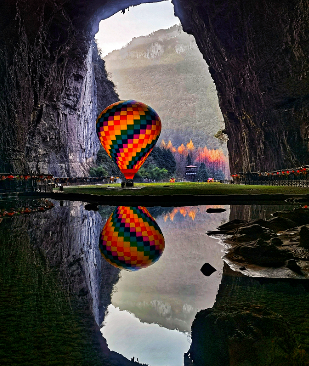 ☀午后的洞口光影:从佛到池处往外看,洞顶的钟乳石伴着午后的点点微光透过缝隙洒落在水面上,伴着五彩斑斓的热气球,随手一拍都是氛围感大片。